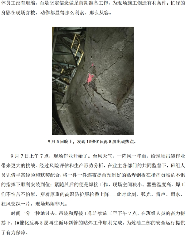臺(tái)風(fēng)前夕!北海公司對(duì) 1#催化再生循環(huán)斜管貼焊搶險(xiǎn)