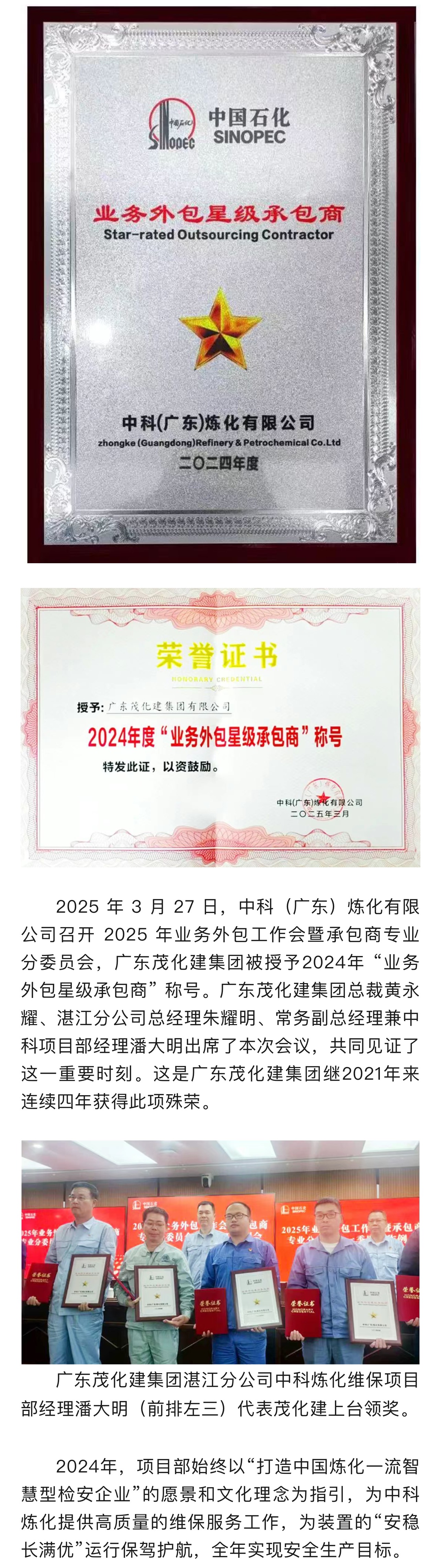 喜報|榮獲2024年中科煉化 “業(yè)務外包星級承包商”稱號
